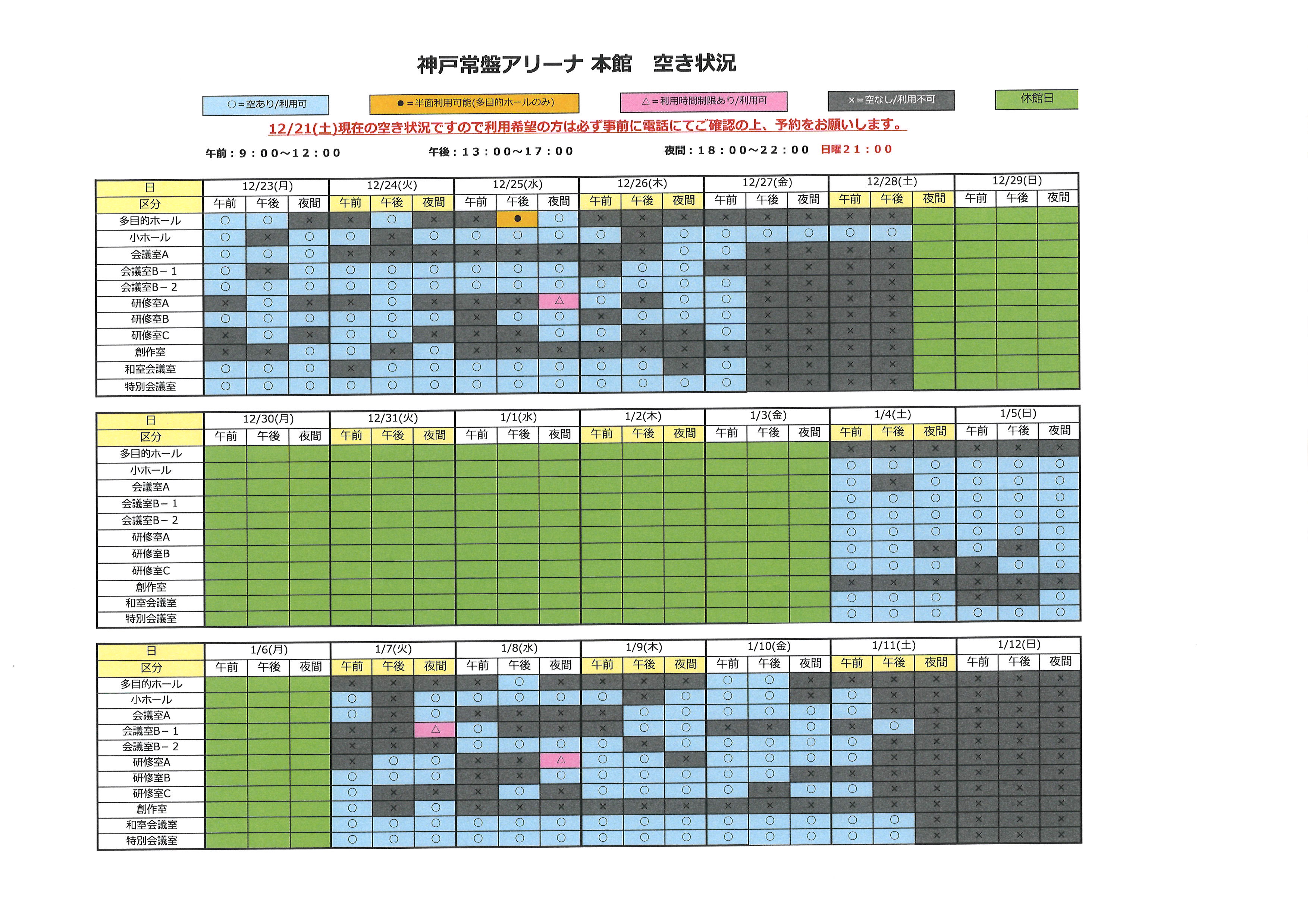 2024年12月23日(月)から2025年1月12日(日)の施設空き状況です。
