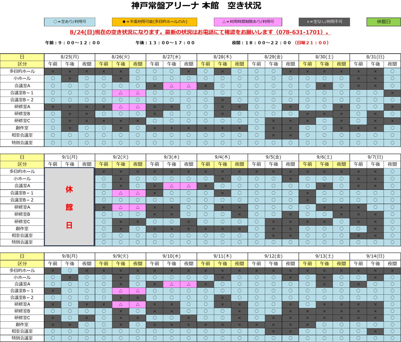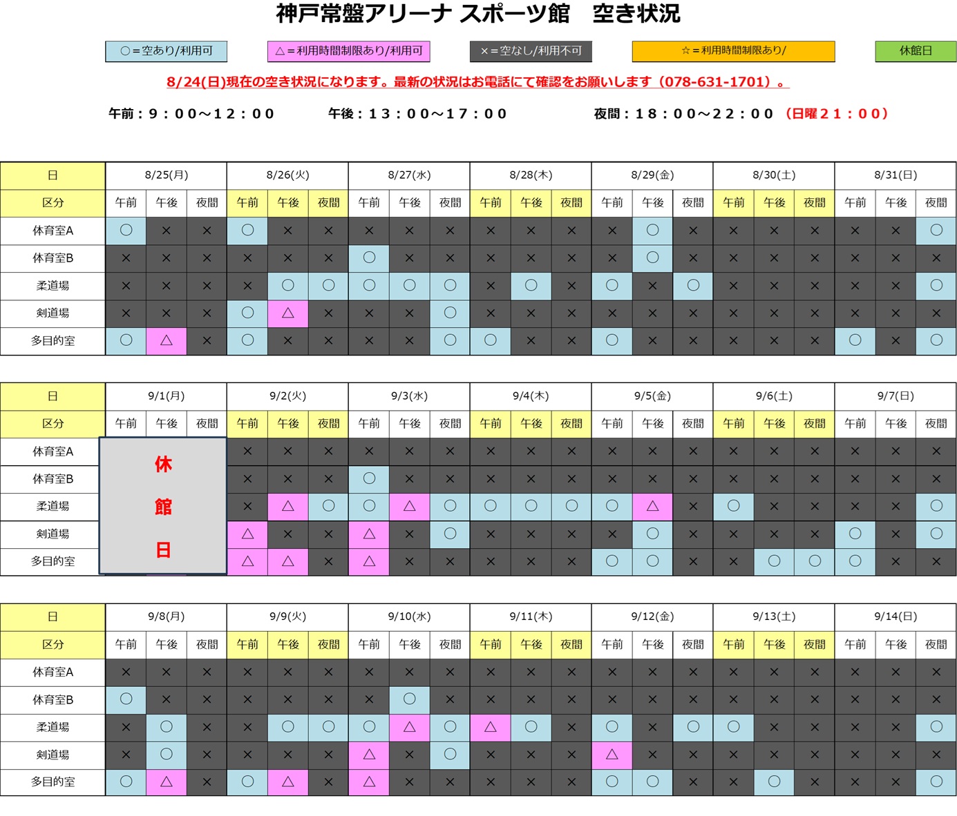 2025年8月25日(月)~ 9月14日(日)の施設空き状況(8/24現在)