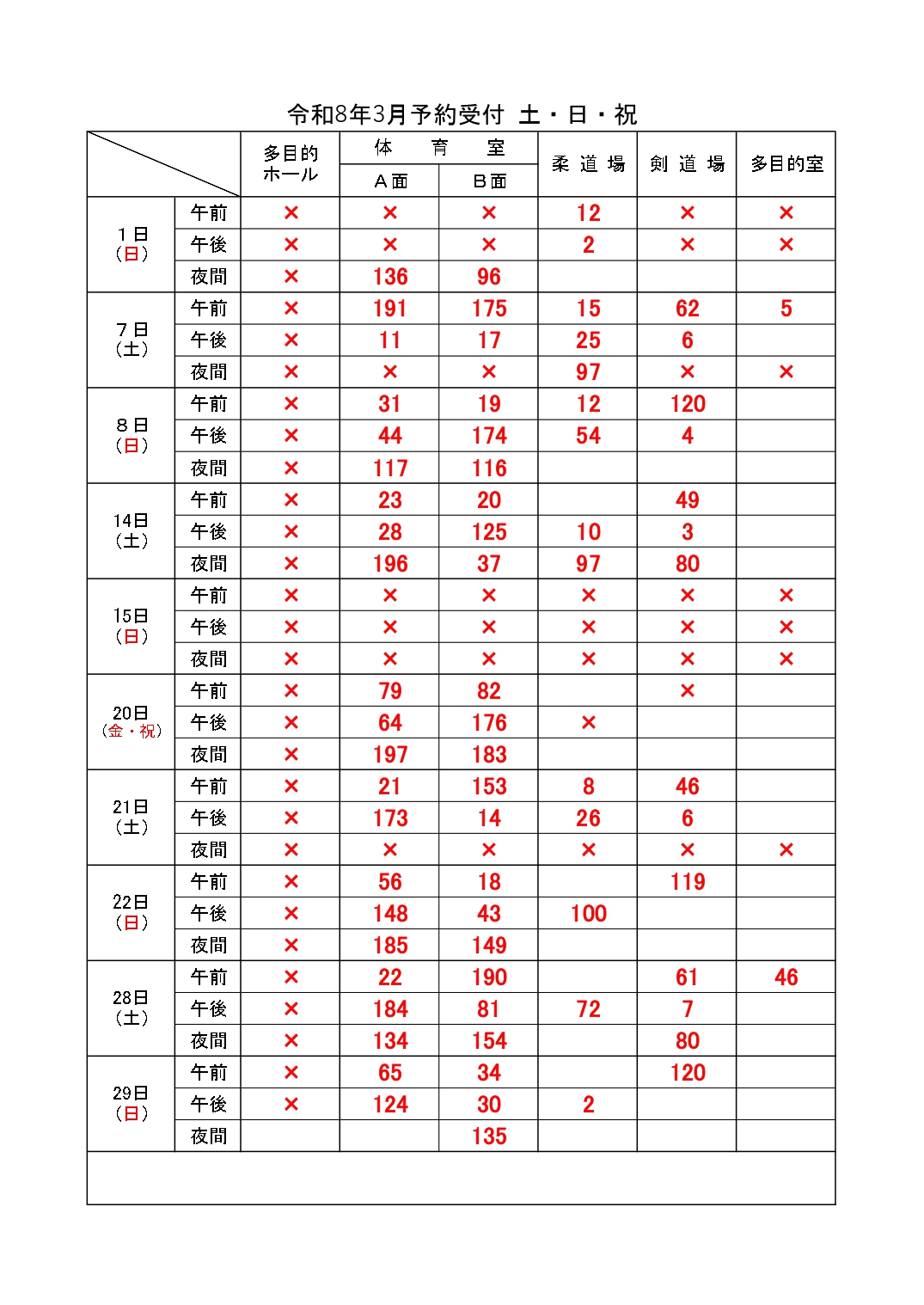 11月22日(土)に実施しました、令和8年3月分(土・日・祝日分)の抽選結果をお知らせ致します。