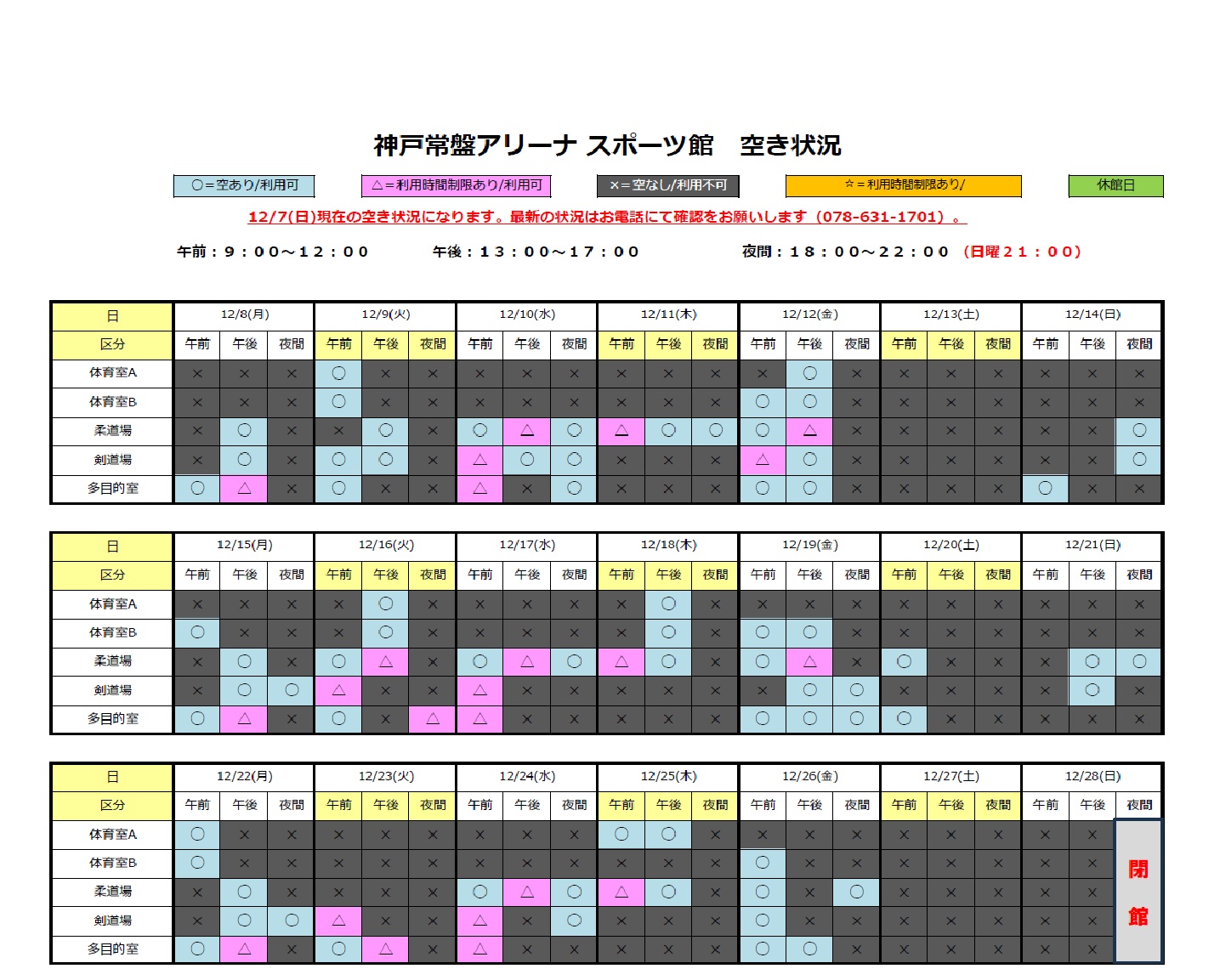 2025年12月8日(月)から2025年12月28日(日)の施設空き状況をお知らせします。